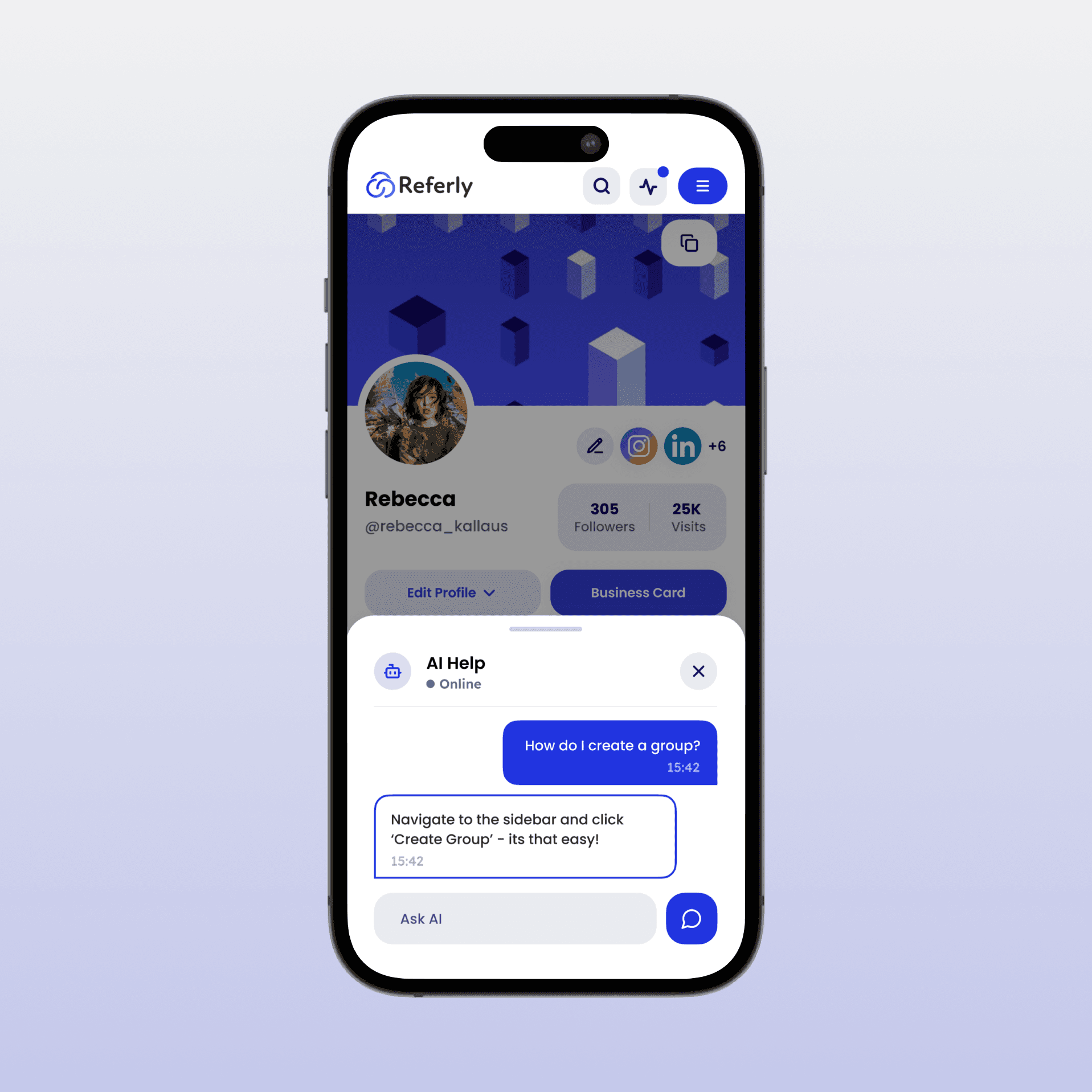 A helpful AI chatbot to assist you in navigating Referly without needing to remove you from the task at hand.