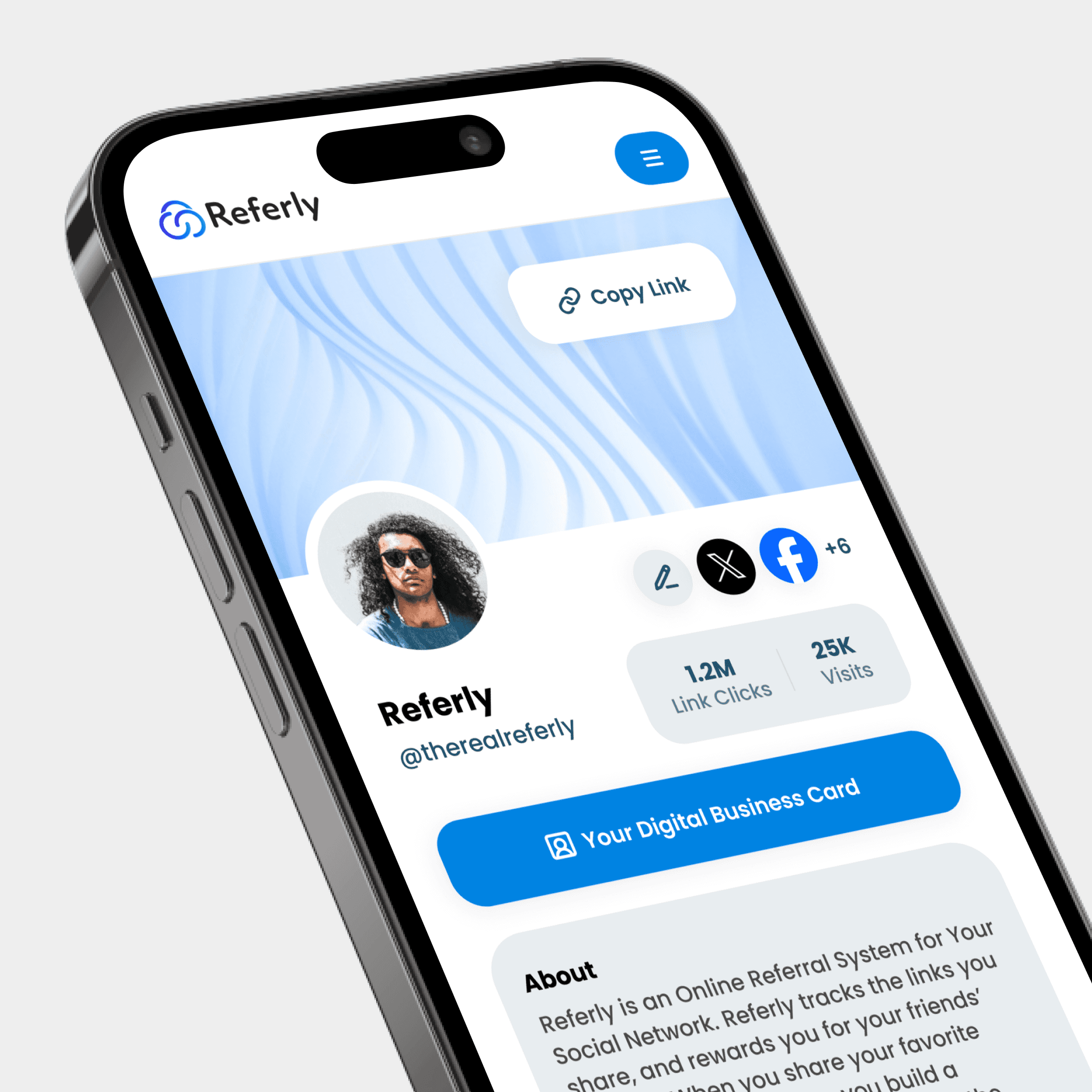 The main profile page, displaying the users Name, Social links, Description, etc.